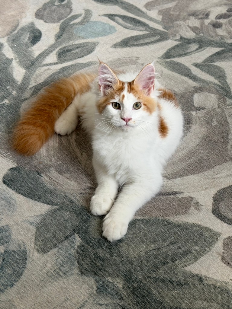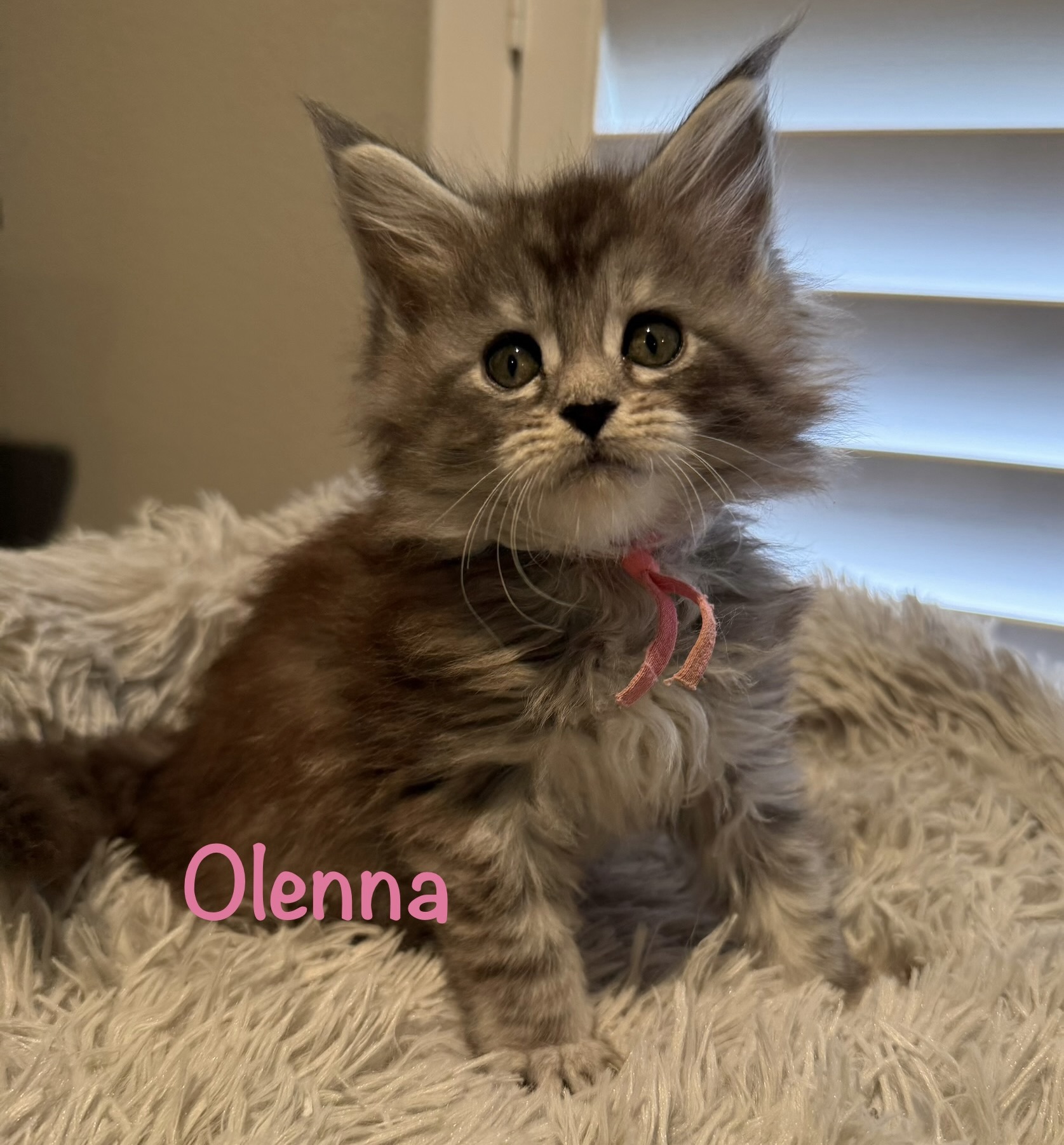 Parents can be seen on the Maine Coon page. Our kittens start at $2500 and can go home at 13-14 weeks. They will receive two combo vaccinations and health certificate from our veterinarian.