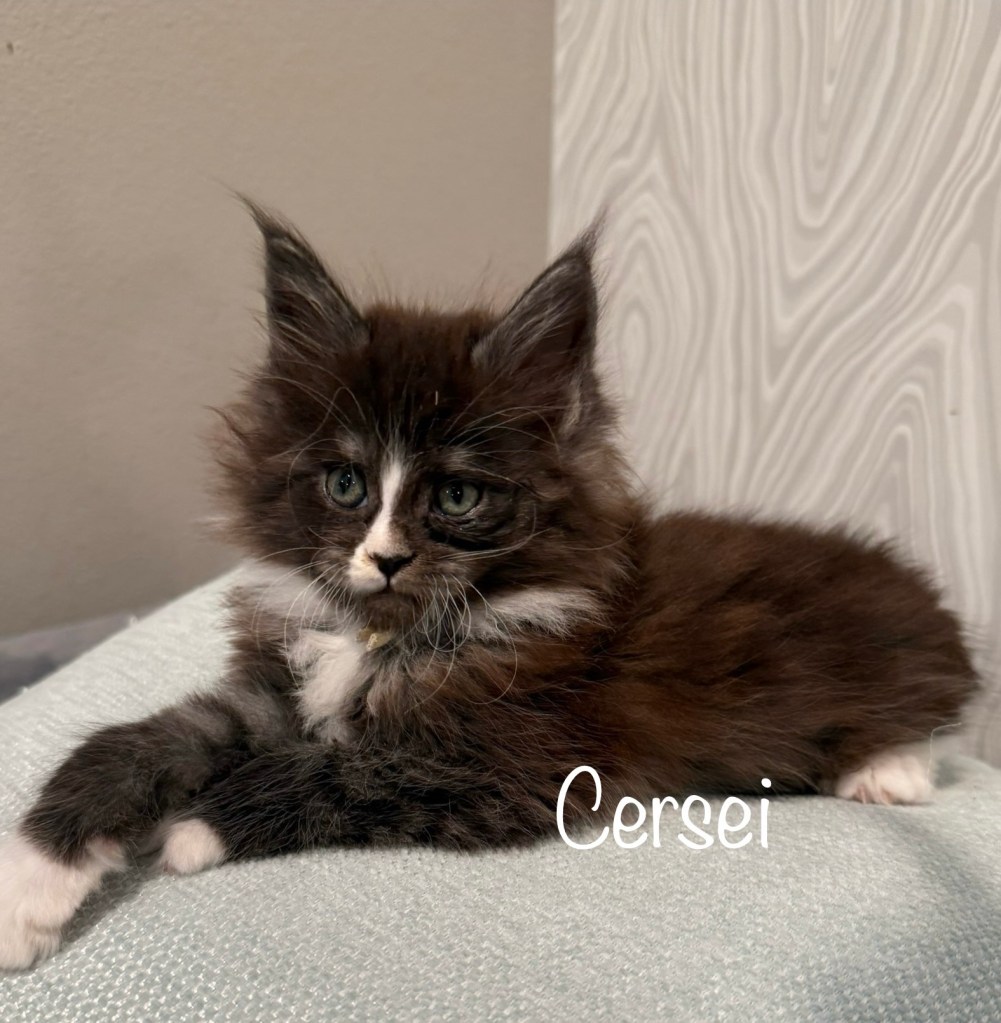 In new home!! Cersei is a black smoke and white female from Vitani and Milo. She can go home first week of April.